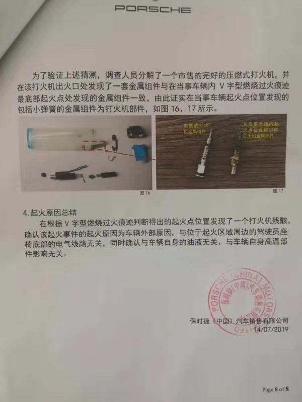 保时捷中国出具的报告显示,保时捷调查团队在拆解座椅的过程中,发现驾驶座位下方有一个包含小弹簧的金属组件,判断金属组件不属于原车辆的车身部件。他们分析认为,这个部件很可能是一个打火机的一部分。并且与一个压燃式打火机进行了对比,发现金属部件一致。