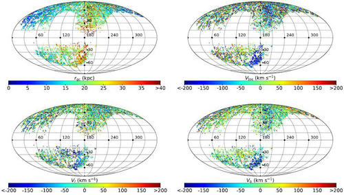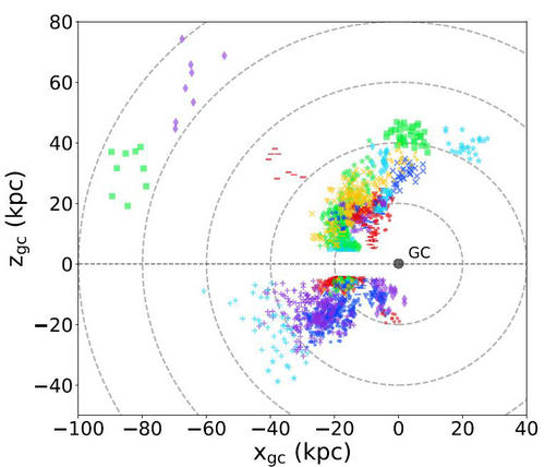 研究人员在对样本中具有相似速度和位置的恒星进行归类和分组后,在13000颗晕星样本中找到了40余组,近2000颗晕星是属于子结构的(见图2),这些恒星具有明显区别于本地晕星的成团性(位置和速度空间)。此外,还找到了18组、300余颗很可能是首次被发现的新的子结构。