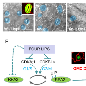 气孔是分布在所有陆地植物叶片表面的特化表皮细胞结构。气孔保卫细胞根据环境条件变化和节律发生“运动”改变气孔大小,调控植物与外界的气体交换和水分蒸发,直接影响了光合作用碳同化和水分利用效率。模式植物拟南芥FOUR LIPS (FLP) 是最早被发现的气孔发育关键基因之一。FLP基因突变可导致保卫细胞母细胞的冗余分裂,如flp-1突变体中可形成四个保卫细胞相邻的异常气孔簇。多个实验室已经发现,MYB转录因子FLP可通过调控编码CYCA2细胞周期蛋白和细胞周期蛋白依赖激酶(CDKB1,CDKA)基因转录水平参与气孔发育后期细胞分裂。