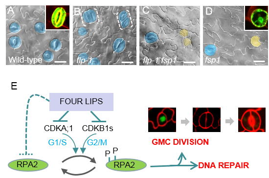 RPA2a调控气孔发育对称分裂的分子机制。(A-D) 经过透明处理后拟南芥子叶的DIC照片。(A) 野生型中分散分布的正常气孔(浅蓝色填注);插图,成熟气孔特异标记E1728在一对保卫细胞中的荧光信号。(B) flp-1中存在由4个保卫细胞形成的气孔簇。(C) flp-1 fsp1双突变体中气孔簇形成受到明显抑制,但也出现了没有进行分裂的异常气孔(黄色填注)。(D) fsp1单突变体。插图,E1728表达说明单一保卫细胞气孔的形成。(E) CDKB1和CDKA受到FOUR LIPS转录调控;CDK所介导的RPA2磷酸化决定RPA在参与气孔保卫细胞精细调控和DNA修复的功能。