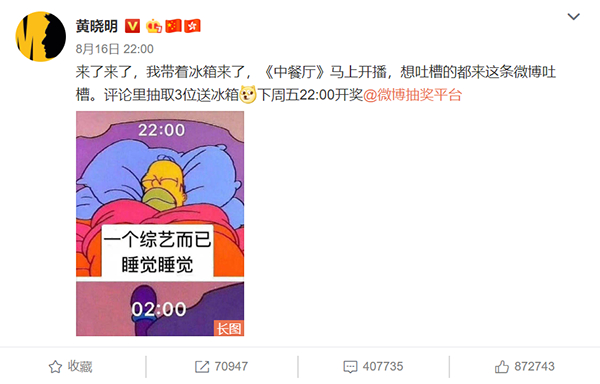 黄晓明微博送冰箱,自我解嘲