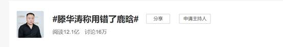 截至8月21日上午8时,#滕华涛称用错了鹿晗#阅读量超过12亿次。