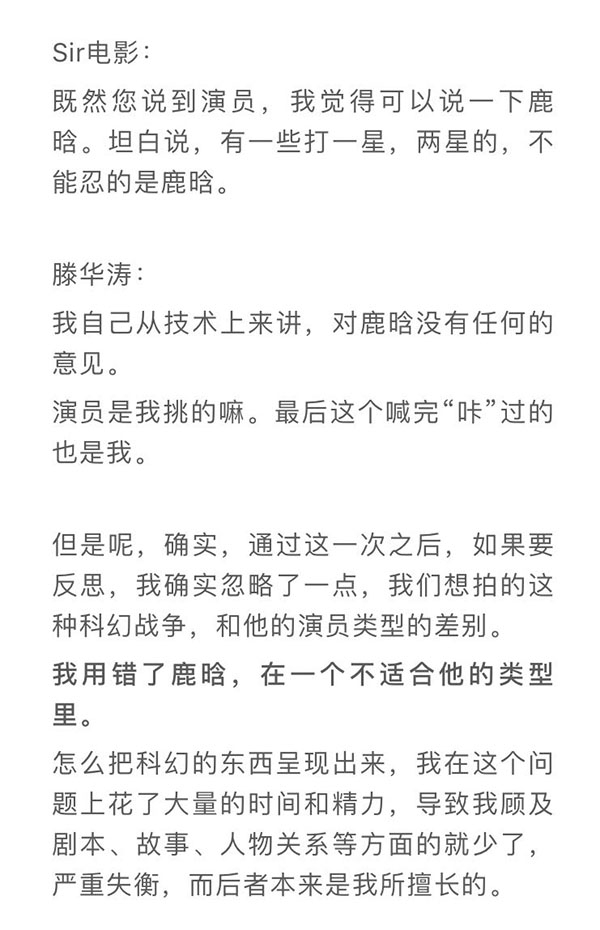事实上,在滕华涛的采访里,他并没有指责鹿晗的意思,反倒将责任往自己身上揽,滕华涛说,“我自己从技术上来讲,对鹿晗没有任何的意见。演员是我挑的嘛。最后这个喊完‘咔’过的也是我。但是呢,确实,通过这一次之后,如果要反思,我确实忽略了一点,我们想拍的这种科幻战争,和他的演员类型的差别。我用错了鹿晗,在一个不适合他的类型里。”