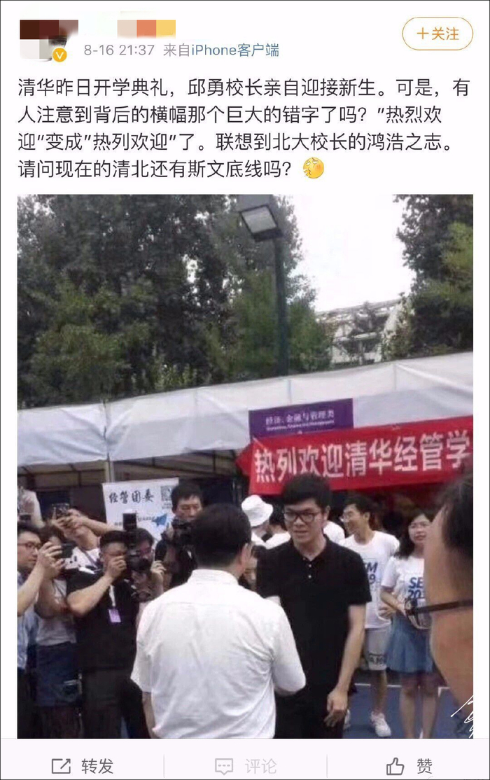 继去年北大校长在校庆上读错“鸿鹄”之后,近日,清华校园内又惊现“热列欢迎”标语……