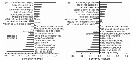 此外,工程热物理所博士刘岳曦在德国宇航中心访学期间,开展了T=700-1500K、当量比为1的高压(P=16bar)激波管实验,得到了燃料的着火延迟时间,并利用层流燃烧炉在T=473K、P=1atm、Φ=0.6-2.0的实验条件下测量了火焰传播速度。根据实验测量结果,结合量子化学计算方法得到重要的初始反应速率常数,建立了包含401种组分和2838种反应的详细化学动力学机理。该反应机理能够很好地模拟出实验中所得到的摩尔分数曲线、着火延迟时间、火焰燃烧速度,在低温氧化和高压激波管实验中观察到的NTC效应通过该机理也得到了很好的预测,说明该反应机理能够很好地预测模型燃料的燃烧特性。根据在900K下的反应路径分析可知:在此温度下,1,3,5-三甲基环己烷主要通过脱氢反应生成PXCH2D35MCH自由基消耗;正丙苯通过脱氢生成更多的A1CHCH2CH3和A1CH2CHCH3自由基,随后发生β解离生成苯乙烯;正十二烷主要通过脱氢反应消耗生成C12H25自由基,该自由基通过O2加成反应生成过氧化自由基PC12H25O2。根据在900K下的敏感性分析(图2)可知:反应T135MCH+H=PXCH2D35MCH+H2是对1,3,5-三甲基环己烷消耗起到作用最大;反应NPB+OH=A1CHCH2CH3+H2O对正丙苯的消耗起到最大作用;反应CH3+O2=CH2O+OH和反应CH3+CH3(+M)=C2H6(+M)是分别对两个组燃料组分的消耗起到了最大的促进和抑制作用的反应。同时,正十二烷消耗过程中的关键反应P12OOHX2=PC12H25O2同时对这两个组分的氧化起到了抑制作用。