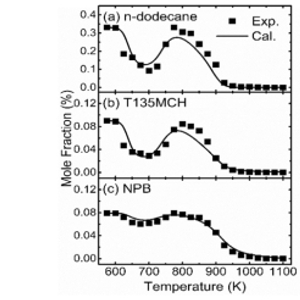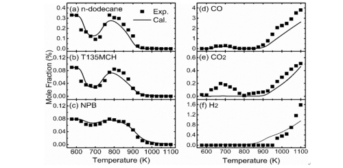 近期,中国科学院工程热物理研究所新技术实验室研究人员对由正十二烷(66.2%)、正丙苯(15.8%)和1,3,5-三甲基环己烷(18.0%)组成的三组分航空模型燃料的燃烧动力学进行了研究。该模型燃料的组成(H/C比值和摩尔质量)与Jet-A和RP-3航空燃料相似,因此,采用该模型燃料来预测和模拟实际航空煤油是可行的。研究人员利用射流搅拌反应器在P=1atm、T=575-1100K、Φ=2的实验条件下进行了氧化试验,得到了物种摩尔分数曲线(图1)。