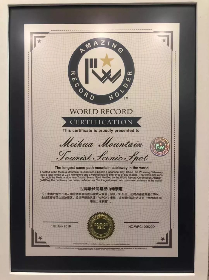 据了解,去年8月,梅花山索道向世界纪录认证机构(WRCA)提出认证申请,经过实地考查、现场核实、资料审核等全球统一认证标准审核,梅花山索道于近日成功获得该机构的认证,成为世界最长同路径山地索道。