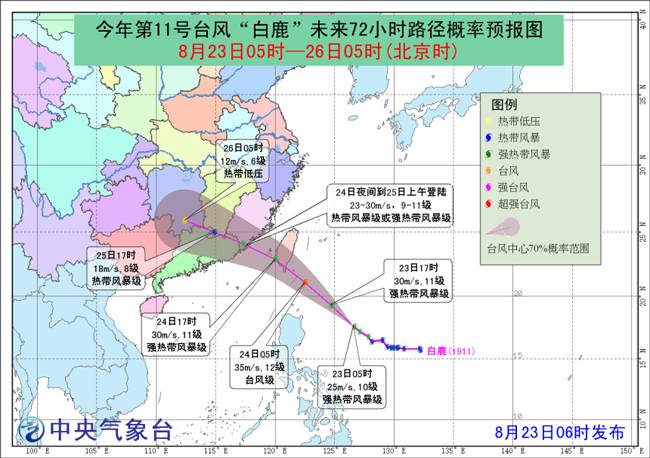 预计,“白鹿”将以每小时20-25公里的速度向西北方向移动,强度继续加强,并向台湾岛东南部沿海靠近,将于24日白天登陆或擦过台湾岛东南部沿海(10-12级,28-35米/秒,强热带风暴级或台风级);尔后向闽粤沿海靠近,将于24日夜间到25日上午在福建中部到广东东部一带沿海再次登陆(9-11级,23-30米/秒,热带风暴级或强热带风暴级)。中央气象台8月23日06时发布台风蓝色预警。