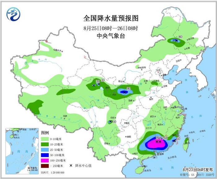 8月25日08时至26日08时,甘肃东部、宁夏南部、青海北部、内蒙古东部、吉林西北部、四川盆地西南部、江南南部、华南中北部等地部分地区有大到暴雨,其中,湖南南部、江西南部、广西东北部、广东北部等地部分地区有大暴雨,江西南部、广东北部等地局地特大暴雨(250~270毫米)。福建、浙江东部等地部分地区有5~6级及以上风。