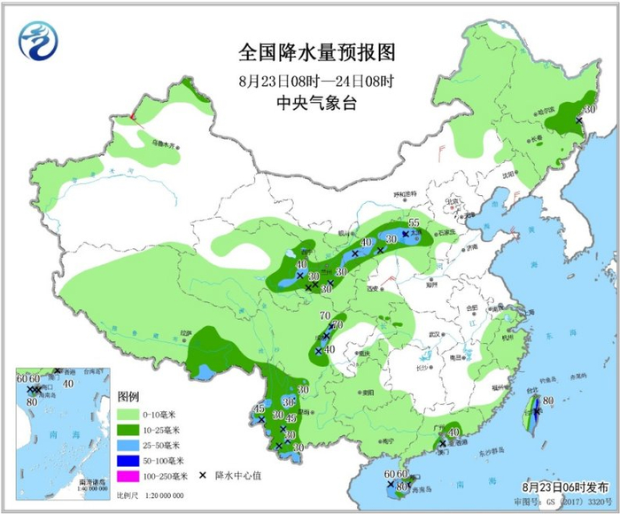 8月23日08时至24日08时,西北地区中东部、华北西部、黑龙江南部、四川盆地西部、云南西部、西藏东南部、广东中部、海南岛、台湾岛等地部分地区有中到大雨,其中,山西西北部、四川盆地西北部、海南岛、台湾岛东部等地局地有暴雨(50~80毫米)。内蒙古中部、辽东半岛、陕西中部、山东半岛等地部分地区有4~5级及以上风。