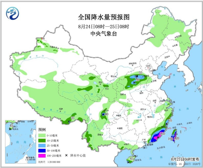 8月24日08时至25日08时,陕西北部、华北西部、四川盆地西南部、广东东部、福建中东部、浙江东南部、海南岛、台湾岛等地部分地区有中到大雨,其中,山西中北部、四川盆地西南部、福建东部、广东东部、台湾岛东部和南部等地局地有暴雨,福建东南部以及广东东部沿海、台湾岛东部和西南部局地有大暴雨(100~160毫米)。浙江南部、福建东部等地部分地区有5~6级及以上风。