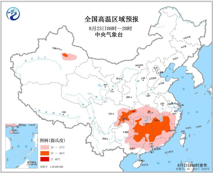 未来三天,西南地区东部、江南、江汉、华南等地将有高温天气。中央气象台8月23日06时继续发布高温黄色预警。预计8月23日白天,江南大部、华南中北部、西南地区东部、江汉大部、江淮西部等地有35℃以上高温天气,其中,湖南大部、江西大部、福建西北部、四川盆地东部、广西北部、广东北部等地的部分地区最高气温可达37~39℃,重庆北部局地可达40℃以上。