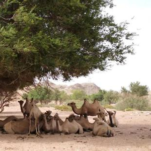 突然出现一峰骆驼,挡在车前,瞪大眼睛看着我们坐的这个铁怪物,远处更多的骆驼在树荫下观望。但树,却只有一色的榆树。在戈壁这种“夏日如烧,冬风如刀”的大环境下,能够存活的大乔木只有榆树。这时连大名鼎鼎的胡杨也不见了踪影,更不用说所谓“岁寒而后凋”的松柏了。大漠最可怕的不是寒,而是干。要窒息生命,干涸比寒冷更彻底。