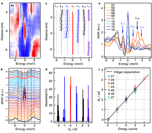 自2018年7月开始,丁洪和高鸿钧进一步紧密合作,共同指导博士研究生孔令元、朱诗雨和博士陈辉等在前期工作的基础上对FeTe0.55Se0.45超导涡旋中的束缚态进行了更加全面系统的研究。他们在高鸿钧研究组的居国际顶尖水平的极低温强磁场扫描隧道显微镜(STM)联合系统上开展实验研究工作,通过扫描隧道谱实验发现有两类超导涡旋共存于样品表面。马约拉纳零能模存在于拓扑涡旋中,同时伴有整数量子化能级序列的涡旋束缚态(En=nΔ2/EF, n=0, ±1, ±2, … 其中n=0 是马约拉纳零能模)(图1)。与之相对应,在另一类平庸涡旋中没有马约拉纳零能模,且其涡旋束缚态能级序列呈现半整数行为(En=nΔ2/EF, n= ±1/2, ±3/2, ±5/2, … )(图2)。实验团队对这两类涡旋分别实现了35次和26次重复观测,涡旋束缚态的统计分布表现出鲜明的整数或半整数量子化特征。涡旋束缚态在两类超导涡旋之间的半整数能级嬗移与马约拉纳零能模的出现紧密相连,反映了马约拉纳零能模的拓扑本质。麻省理工学院教授Liang Fu、博士研究生Michal Papaj 通过理论模拟发现,两类超导涡旋之间的半整数能级嬗移可以被拓扑表面态的不均匀分布所解释。实验团队随后测量了选定涡旋晶格区域中束缚态的集体行为,发现同一类涡旋总是成群出现,支持了狄拉克表面态不均匀分布的理论预期。由于Fe(Te,Se)自旋轨道耦合能隙较小(~20 meV)并且具有掺杂导致的本征不均匀性,强拓扑绝缘体态可能在部分区域被破坏,使得这些区域的(001)表面上拓扑表面态缺失,拓扑表面态移动到材料内部,因此STM观测的超导涡旋呈现半整数能级序列的平庸行为。与之相反,在拓扑表面态保持完好的区域上,由于狄拉克表面态的参与,拓扑涡旋中涡旋束缚态呈现整数能级序列的拓扑行为,这时马约拉纳零能模就是整数能级序列中的第0级束缚态(图4)。实验团队还在拓扑涡旋中观测到了狄拉克表面态诱导涡旋束缚态所独有的能级序列空间分布特征,强烈地支持了马约拉纳零能模来源于狄拉克表面态超导准粒子的结论(图3)。研究团队还进一步发现,存在一部分拓扑涡旋不满足整数量子化特征:马约拉纳零能模看起来十分孤立,其余高能束缚态聚集在超导能隙附近。理论模拟显示,在拓扑涡旋中当化学势十分接近狄拉克点时,量子限域效应破坏了涡旋束缚态的等距分布。与此同时,马约拉纳零能模被很大的准粒子能隙强烈保护,有利于减小准粒子中毒效应的影响。理论进一步预言,当费米能级恰好位于拓扑表面态的狄拉克点时,其他高能束缚态将会被全部压缩到超导能隙边缘,马约拉纳零能模是超导能隙内唯一允许的涡旋束缚态。这时马约拉纳零能模处在最佳状态。这个结论暗示,未来发展电场效应可调控的超导涡旋系统对实现拓扑量子计算具有十分重要的意义。
