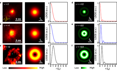 图3 拓扑涡旋(左)中前两级涡旋束缚态的波函数呈现实心分布,而平庸涡旋(右)中只有第一级束缚态呈现实心分布。拓扑涡旋的独特性质是由于狄拉克表面态参与导致的。