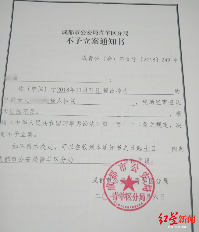 在秦莉提供的一份行政复议申请书中,红星新闻记者看到,2018年11月21日,申请人秦莉因女儿下身恶臭一年多,怀疑被性侵,向青羊区派出所报案,对派出所不予立案的行政行为提出行政复议。而在行政复议后,警方又进行了调查,结果依旧因证据不足,不予立案。
