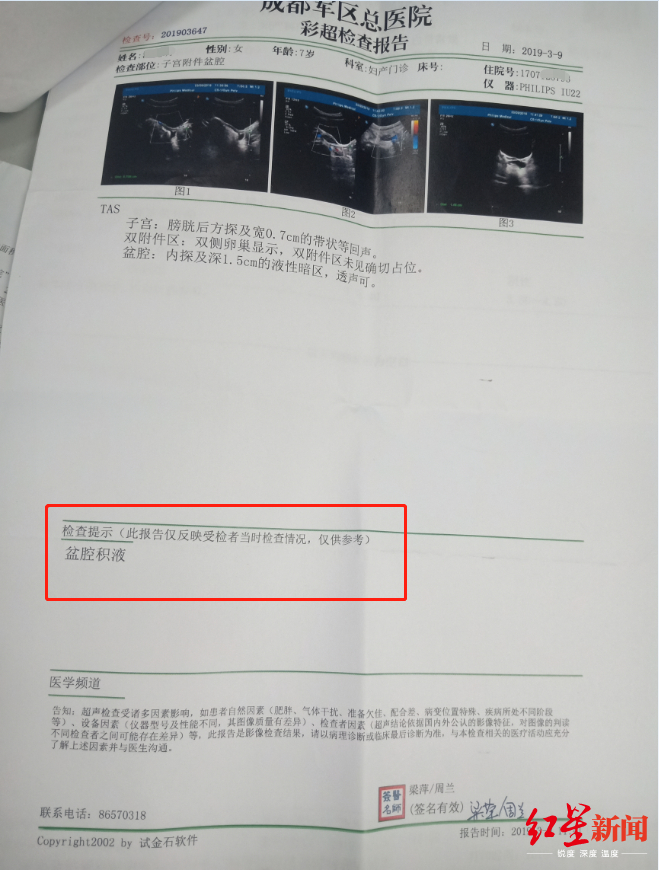 红星新闻记者看到,在2017年7月12日的一份化验单中,检查结果显示为:外阴炎。而在今年3月9日的化验单中,诊断结果显示为盆腔积液。秦莉告诉红星新闻记者,短短两年之内,两种“妇科”病找上自己未成年的女儿,再联想起女儿曾在自己身上做一些奇怪的动作,她来不及细想立马拨通了报警电话。