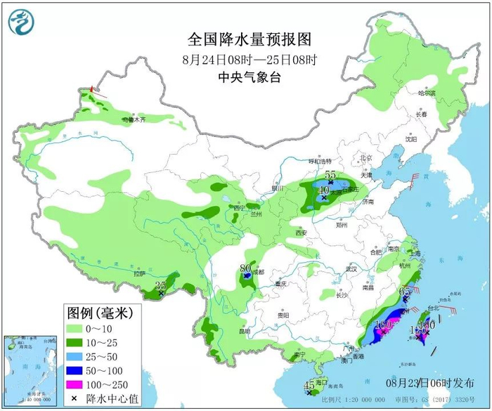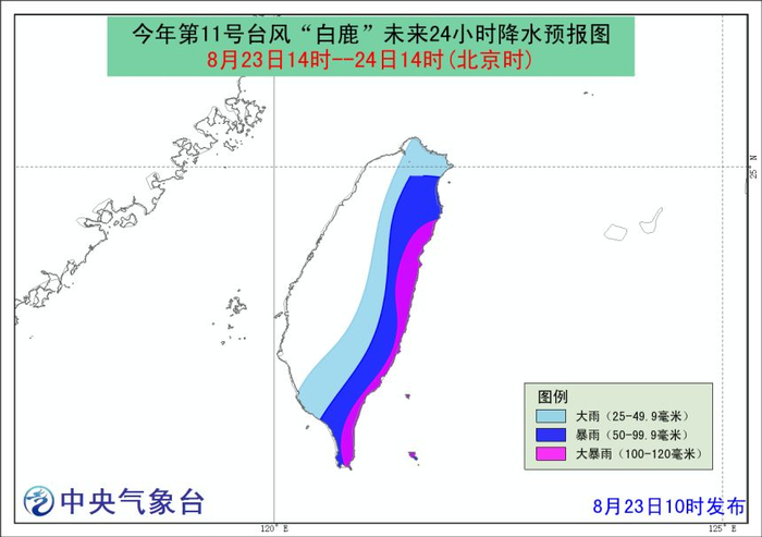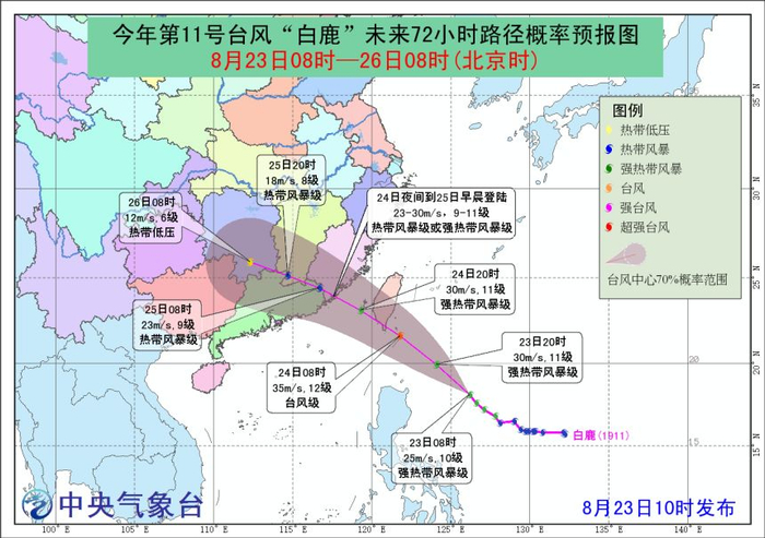 今年第11号台风“白鹿”(热带风暴级)于8月21日下午在西北太平洋洋面上生成,昨天(22日)夜间由热带风暴级加强为强热带风暴级,今天(23日)下午14点钟,其中心位于我国台湾省鹅銮鼻东偏南方向约570公里的海面上,中心附近最大风力有10级(25米/秒)。