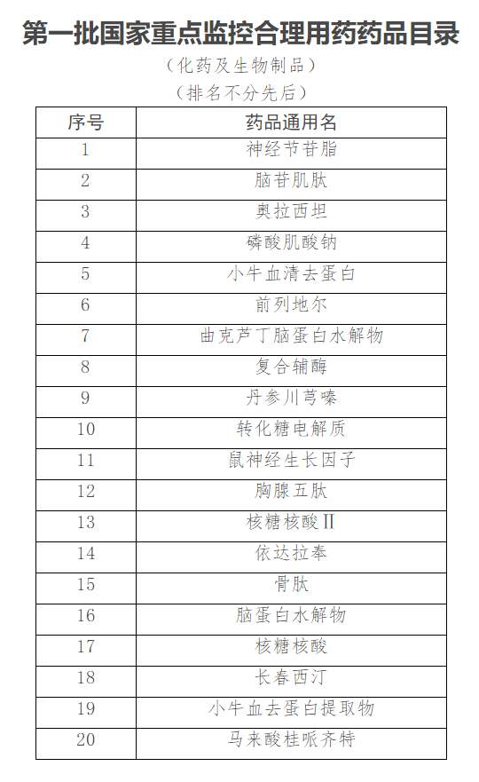 今年7月1日,国家卫健委发布《关于印发第一批国家重点监控合理用药药品目录(化药及生物制品)的通知》,神经节苷脂、脑苷肌肽、奥拉西坦、小牛血清去蛋白、前列地尔、复合辅酶、鼠神经生长因子等20种药品被列入国家重点监控目录清单。