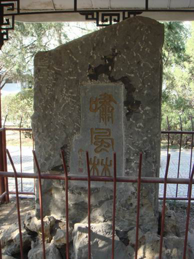 在吴作人先生住处,公交车有“老虎庙”一站,近邻是劳动关系学院(原全总干校)。学院内一丛松林里,卧有一尊石虎,据说这就是老虎庙的遗存。旁边有新建的碑亭,碑上 “啸风林”三个大字,是吴先生亲笔手书,碑文也是他写的: