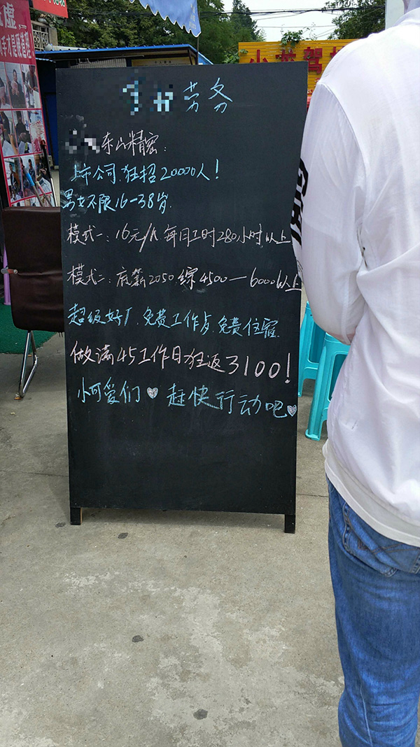 老板娘是一位中年妇女,一进店便拉着我们加微信,“加个微信以后我们就是好友,方便联系”,之后开始嘘寒问暖为我们挑选合适的工厂:“小年轻嘛进L厂,活不累工资高,十二小时两班倒,包吃住,宿舍就在厂对面”。