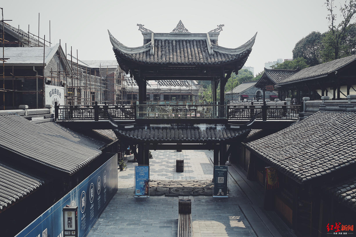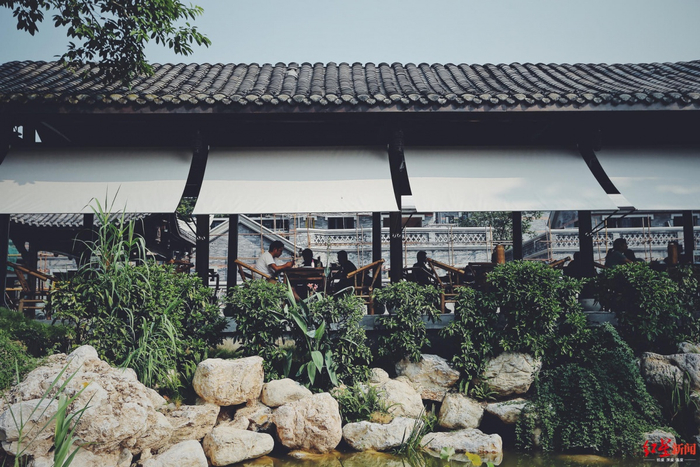 灰砖青瓦的川西民居、传统而古老的拼接式门板,青石板铺设的路面……在东门市井,公馆建筑群、下沉市集广场、铺板小馆、老式茶铺、凉亭水榭等建筑让李劼人笔下的老成都市井生活场景再现,也让当今的消费者“穿越”回百年前看看邓幺姑、罗歪嘴的生活。