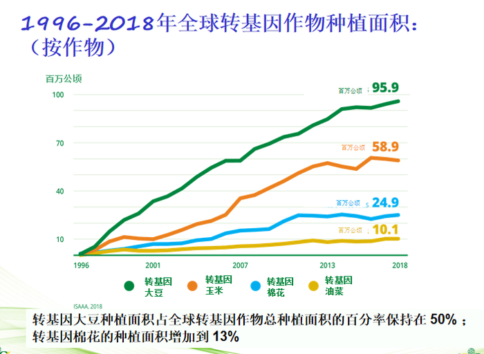 自1996年以来,转基因作物种植面积增加了约113倍,累计面积达25亿公顷。在美国、巴西、阿根廷、加拿大和印度等转基因作物常年应用率较高的国家,主要作物的应用率已接近100%,这表示相比传统作物,农民更青睐于这项作物技术。