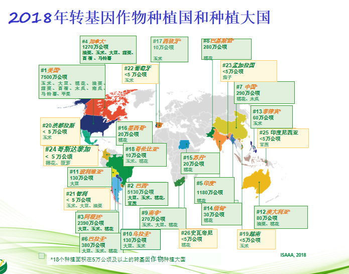 2018年共有70个国家种植或进口了转基因作物,这已是全球连续应用转基因作物的第23个年头。26个国家(21个发展中国家和5个发达国家)共种植了1.917亿公顷转基因作物,比2017年的种植面积增加了190万公顷。