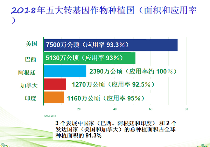 • 种植转基因作物面积最大的前5个国家(美国、巴西、阿根廷、加拿大和印度)占全球转基因作物种植面积的 91%。