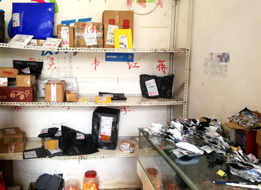 ↑资中县板栗桠镇,某超市代理快递网点,包裹摆放在一角