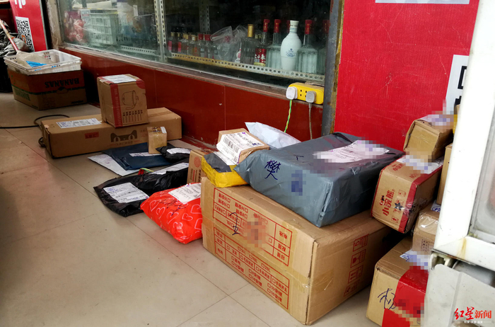 ↑资中县新桥镇某超市代理的快递网点,包裹堆放在一角