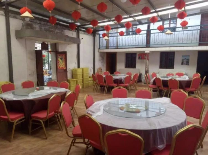 餐厅装饰非常别致,红色的桌椅和房顶上挂满的红灯笼,看起来非常喜庆。