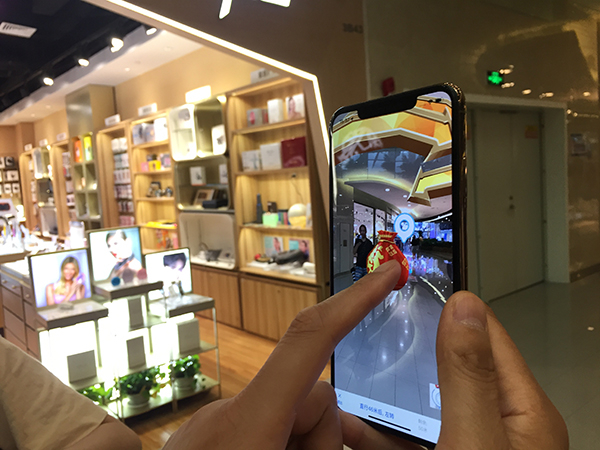 当用手机对准一家商铺的外观或招牌,就会显示出虚拟的装饰物和红包、福袋。
