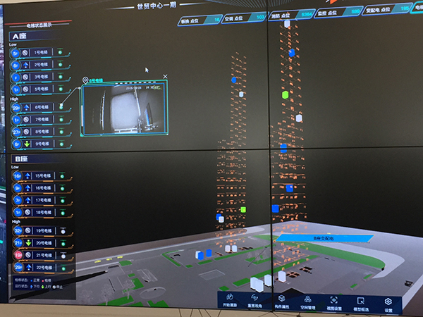 现场工作人员在大屏幕上随意点了一个正在上下运动的绿色的点,屏幕左上角便出现了一个实时监控画面,原来这个绿色的点是一座正在运行的电梯,轿厢内的画面清晰可见,管理者可以随时随地监控到大楼内所有电梯、所有楼层的运行状况。