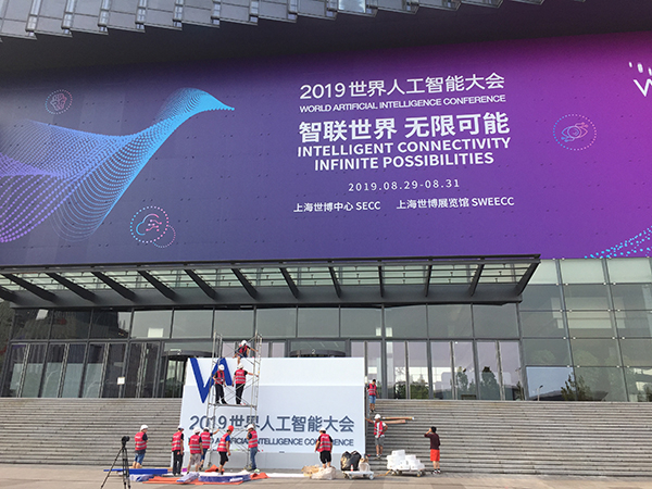 8月26日下午,世界人工智能大会主场馆布展工作正在进行,大会将于29日在此拉开帷幕。本文图均为澎湃新闻记者 俞凯 图