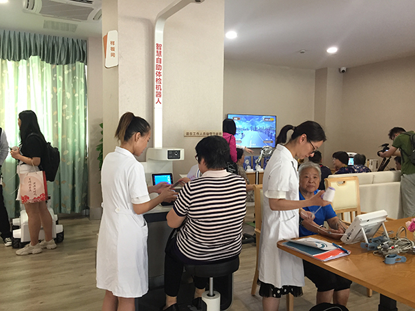 在该服务中心,智慧自助体检机器人可一次同时测量五项身体指标,在医院需要半小时这里只要两分钟就能完成。