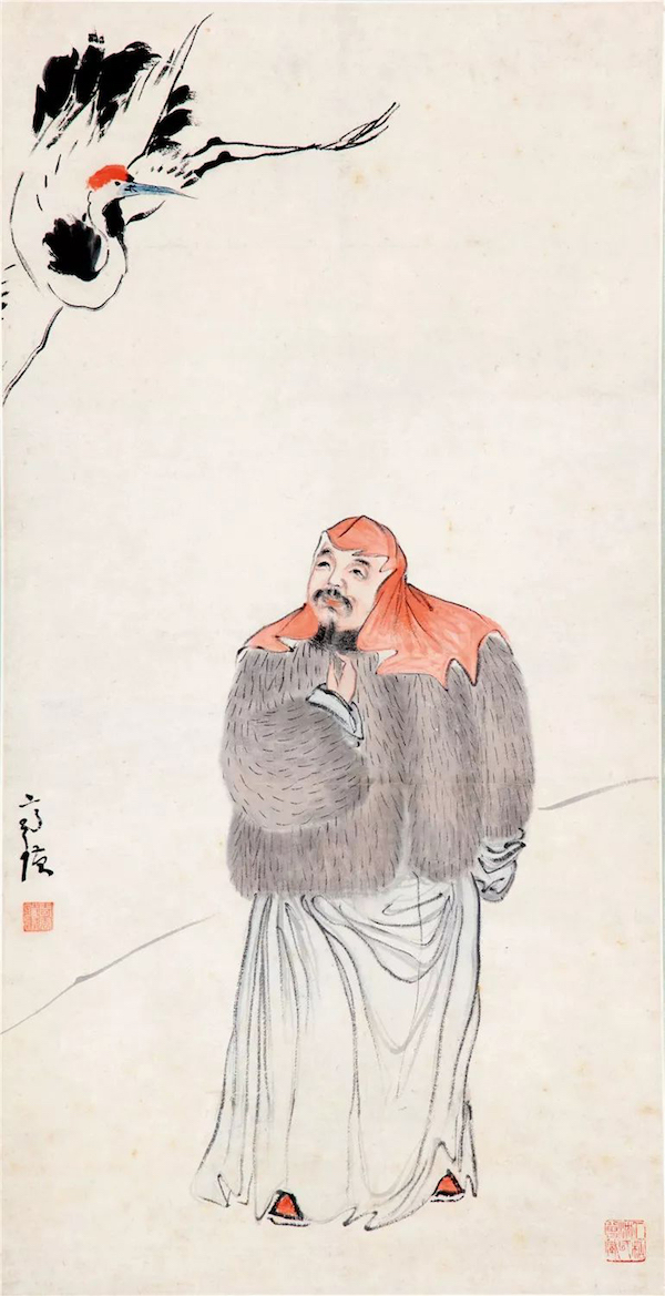 《飞鹤人物图》 齐白石 1897年 73×37.5cm 纸本设色 浙江省博物馆藏