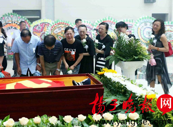 扬子晚报网8月27日讯(通讯员王一伟 谢栋华 朱琳记者施广权)云天凝素,哀乐低回。8月27日上午,建湖县殡仪馆内,建湖县公安局近湖派出所所长仇海辉遗体安卧在鲜花翠柏丛中,身上覆盖着鲜红的中国共产党党旗,数百名群众扶老携幼,含着热泪自发前来悼念、敬献鲜花,送最敬爱的仇所长最后一程:“愿天堂没有病痛,来生更得福报。归来,海辉仍是人民的好警察。”