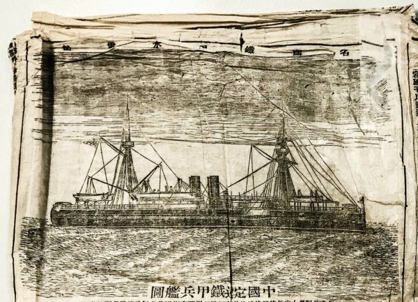 图说:这张定远舰素描,刊载于1885年6月27日发行的《字林沪报》。现收藏于德国人彼得·塔姆的私人图书馆中。(张远 摄)