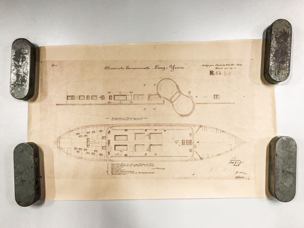 图书馆馆员盖里特·门策尔在一张小桌上为我们展开了两张泛黄卷边的“定远”旧图纸。图纸上方写着“中国装甲巡洋舰‘定远’”。右上方写着“海军枢密顾问报告附件,迪特里希 15/6 83”。