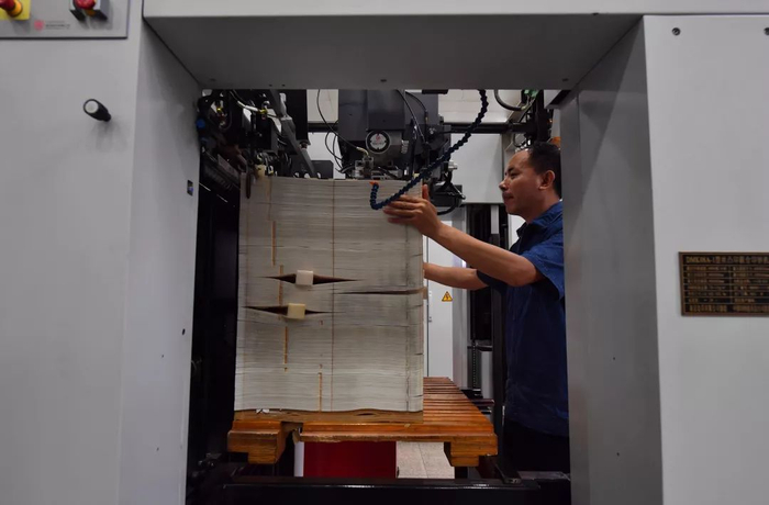 ▲第三道工序是丝凸印,顾名思义就是丝网与凸版联合印刷。工作人员在丝凸印联合印刷机上进行操作。