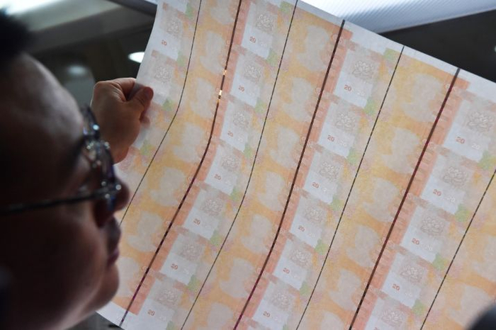 ▲印钞的第一道工序是胶印,这道工序中主要完成钞票正背面底纹图案的印刷。通过鲜亮、精美的底纹图案,赋予钞票特定的色彩美感。工人在检查胶印后的整版钞票。