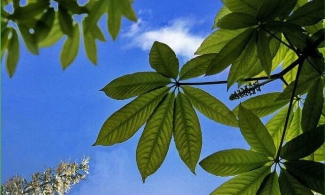 七叶树是落叶乔木,高达25米,树皮深褐色或灰褐色,小枝、圆柱形,黄褐色或灰褐色,有淡黄色的皮孔。冬芽大形,有树脂。掌状复叶,由5-7小组成,上面深绿色,无毛,下面除中肋及侧脉的基部嫩时有疏柔毛外,其余部分无毛。果实球形或倒卵圆形,黄褐色,无刺,具很密的斑点。种子常1-2粒发育,近于球形,栗褐色;种脐白色,约占种子体积的1/2。花期4-5月,果期10月。