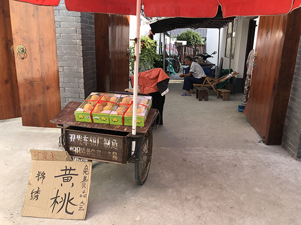 他家住在吴房村中心区域,去吴房村的人,大多会从他家门口经过。于是,他在硬纸板上写上“黄桃免费品尝”,就算揽客了。因为名气大,费士杰也不愁销路。