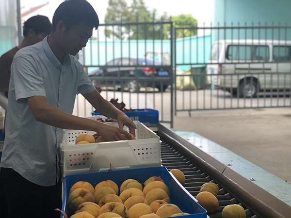 张志强告诉澎湃新闻记者,这个分拣中心属于上海思尔腾农业科技发展有限公司。这家公司2019年1月成立,就是为了销售黄桃准备的。送到这里的黄桃,全部来自公司的自有基地,也全部是公司自己种植。此前,他们承包了吴房村470亩地,以及解放村200多亩地。这些土地,全部来自农民的土地流转。“公司自己种植的好处,是统一标准。”张志强强调,该公司与上海市农科院合作,收上来的土地,全部重新修整,沃肥或轮作,并严格田间管理,以保证出品黄桃的品质。