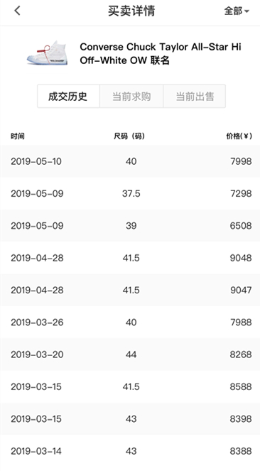 但红星新闻记者在“斗牛DoNew”APP上看到,一双Converse Chuck Taylor All-Star Hi Off-White 联名,发售价为1099元,现在挂售价格为11999元。但成交历史显示,从今年5月10日这个款式一双40码的鞋以7998的价格卖出后,就再也没有成交记录。