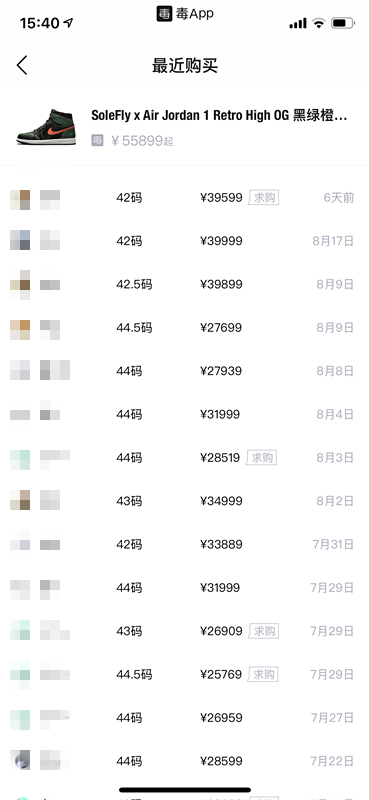 另外,红星新闻记者还在“毒APP”上看到,一双发售价为1399元的SoleFly x Air Jordan 1 Retro High OG 黑绿橙漆皮,现在价格为55899元。而在最近购买中显示,6天前,一位用户以39599元的价格求购到一双42码的鞋子。