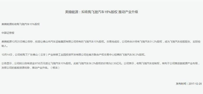2018年,美锦能源称,报告期内除了实现对国内最大的氢燃料电池客车企业飞驰汽车的控股之外,还与广东鸿运高新共同出资设立广州鸿锦投资,持续大手笔投资燃料电池产业。