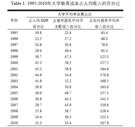 官方统计数据显示(见下表),大学平均教育收费占城市居民平均可支配收入的比重从1995年的19.8%攀升至2001年的56.1%,到2010年则为33.4%;而它与农村居民平均年收入的比值一度在2002年达到170.6%,到2010年仍然为107.8%。可见,大学收费对农村家庭的负担相对更重,孩子上大学的费用甚至成为了农村家庭的最大支出之一(Chen 2012)。这也造成农村孩子的教育期望降低,乃至出现了农村孩子自愿退出高考的行为以及新的“读书无用论”的声音(Li et al. 2012; Chen 2013)。