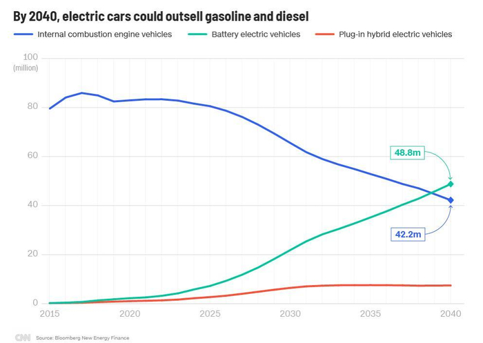 到2040年,电动汽车的销量将超过汽油和柴油车。图据CNN新闻